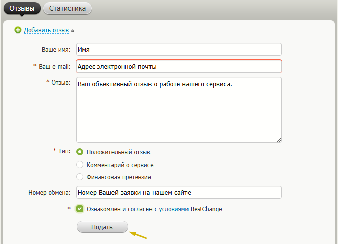 Fill out the form details and specify: name, email address, review text and your application number on our website. Select the type of review, accept the terms of use of the BestChange platform and click on the "Submit" button: